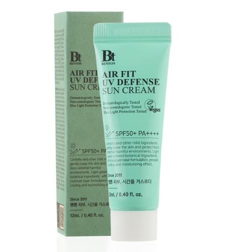 BENTON Air Fit UV Defense Sun Cream — лёгкий крем‑солнцезащитный продукт с широким спектром защиты от UVA и UVB лучей. Средство обеспечивает защиту SPF50+ PA++++, одновременно увлажняет кожу, успокаивает её, укрепляет кожный барьер и делает кожу более мягкой и комфортной. Формула подходит для ежедневного использования и представлена в удобном дорожном формате 12 ml. :contentReference[oaicite:0]{index=0}