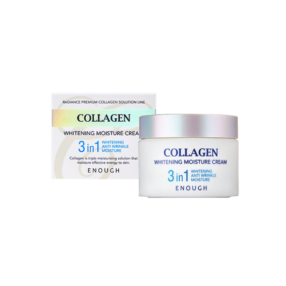 ENOUGH Collagen 3in1 Whitening Moisture Cream — это многофункциональный крем, который сочетает в себе увлажнение, укрепление и осветление кожи. Формула с коллагеном помогает повысить упругость и эластичность, а осветляющие компоненты способствуют выравниванию тона и здоровому сиянию. Крем обладает лёгкой, но насыщенной текстурой, быстро впитывается и подходит для всех типов кожи, особенно для тусклой и обезвоженной.